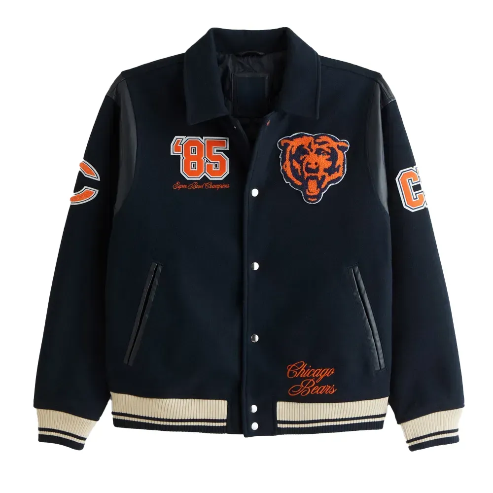 For football fans and sports enthusiasts around the world, the 1985 Chicago Bears Varsity Jacket is a collectible. A wearable homage to one of football’s greatest dynasties.The combination of orange and blue instantly brings to mind Soldier Field and the roaring crowd that supported the Bears as they won titles. This item has a genuine, vintage appearance that is perfect for any ardent fan thanks to embroidered logos and patches, which include the Bears’ iconic emblem and references to the 1985 championship team.