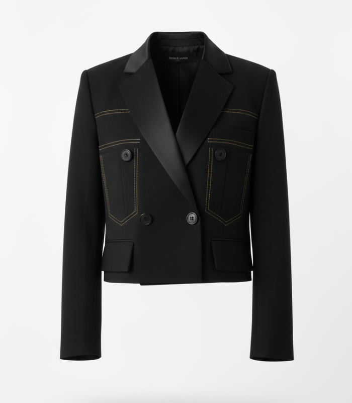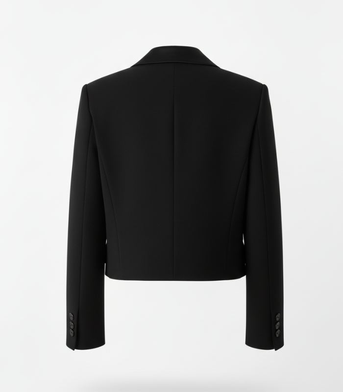Classy cropped fit that flatters every figure. Black shade stays rich and bold. Buttons add a touch of elegance.