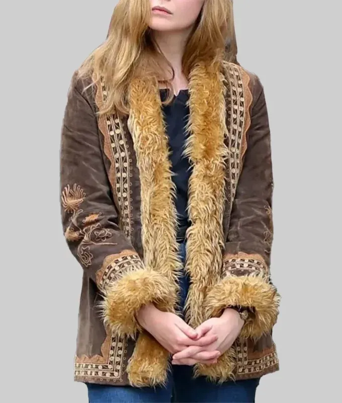 Elle Fanning A Complete Unknown 2024 Sylvie Russo Suede Fur Jacket