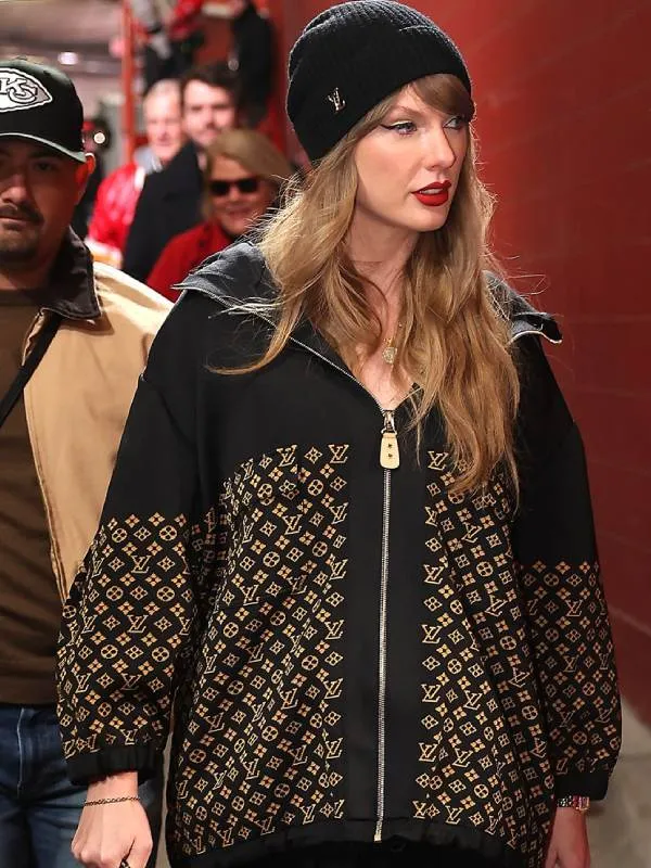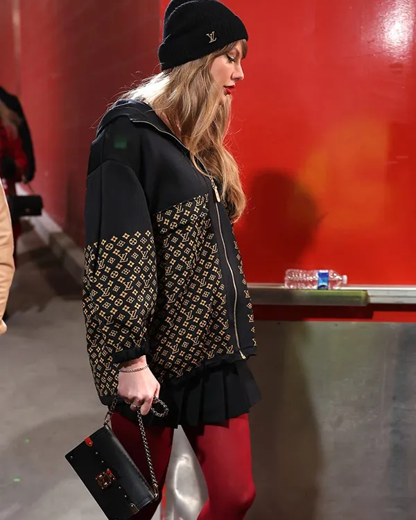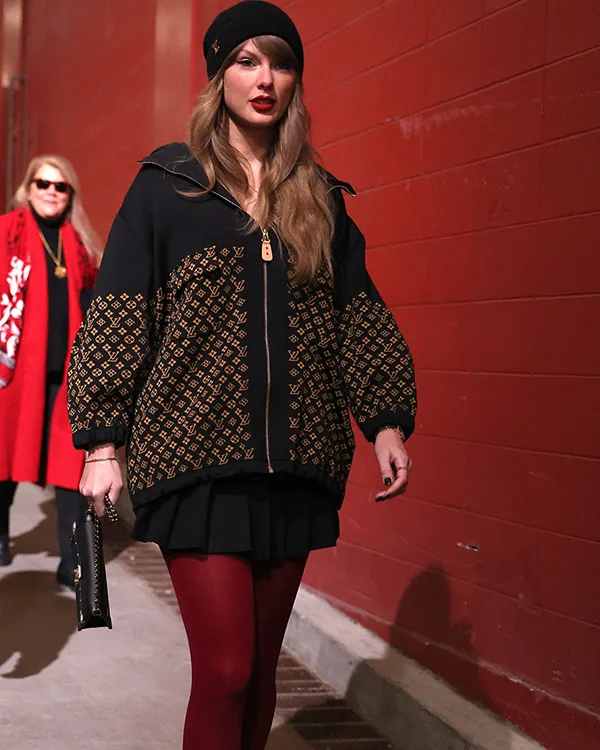 Taylor Swift made a beautiful look on the AFC Championship sport, cheering on her boyfriend Travis Kelce and the Kansas City Chiefs. The international movie star braved the bloodless in fashion, turning heads together with her elegant outfit, which blanketed a black and gold Louis Vuitton monogram jacquard knit jacket, a black beanie, a pleated miniskirt, and formidable red tights. Adding a hint of glamour, Swift paired her appearance with gold accents, which include a chunky gold pendant and a gold bracelet. Her blonde hair tumbled from below her beanie in free waves, whilst dramatic cat eye liner accentuated her eyes and her iconic pink lipstick completed the appearance.