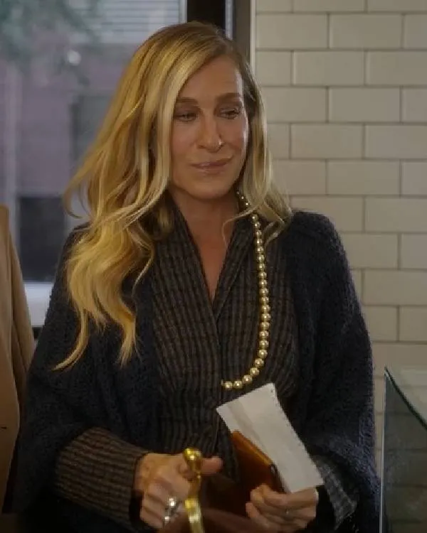Carrie Bradshaw, played by Sarah Jessica Parker in And Just Like That, has long been a symbol of fashion. Carrie, who is well-known for her daring and distinctive sense of style, skillfully combines traditional elegance with contemporary styles. Even a basic ensemble can be transformed into a striking fashion statement by her. Her fitted jacket with checks is the ideal illustration of this. Its structured cut and dark hues give it a polished yet playful appearance that perfectly captures her self-assured, imaginative personality. Carrie always makes an impression, whether she is strolling through the crowded streets of New York or having brunch with friends.