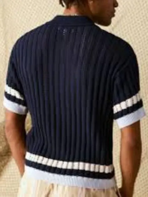 This navy blue striped shirt is fantastic! The knitted fabric feels soft and high-quality. Perfect for a casual yet stylish look.