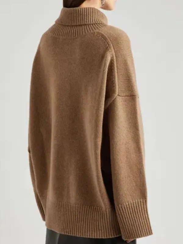 Back in Action Cameron Diaz Turtleneck Sweater made using a knitted base, the sweater is shaped to offer both warmth and comfort. The wide neck rises gently, creating a loose turtleneck that wraps without pressing tight. Full-length sleeves extend down with structure, ending in ribbed edges that help keep the fit neat. The pullover form means it slips on easily without any fasteners. The surface stays simple, with clean lines and soft movement through the fabric. The brown tone adds depth while staying neutral, working well with many other shades. Each part of the design is built to give a smooth experience warm, easy to wear, and suited for quiet days or casual evenings.