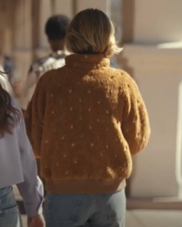 It captures that exact messy-cool energy from the show. It looks like you just threw it on and walked out. The sherpa fleece feels incredibly thick. You get serious warmth. The fit is distinctly boxy. It stays relaxed. That means you get plenty of room to layer underneath. Look at that rich brown shade. It gets broken up by these tiny white scattered shapes. Plus the white zipper piping frames the whole shape. Put this on. It highlights your face well. It makes a basic jeans outfit look completely intentional. Consider this your main defense against cold mornings. You will wear it constantly.