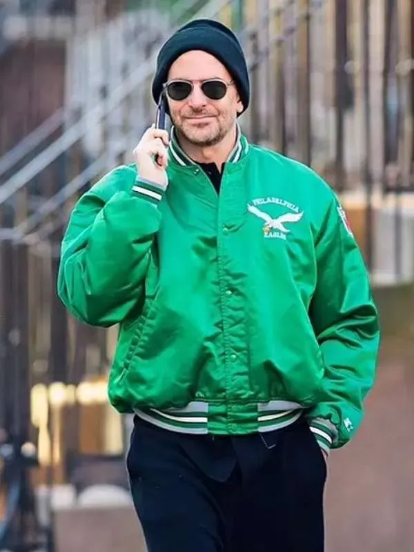 Bradley Cooper Philadelphia Jacket crafted from satin fabric, this jacket gives a sleek, polished look whilst ultimate light-weight and relaxed for each day wear. The clean viscose lining ensures all-day consolation and freedom of movement. The snap-tab button closure gives a at ease healthy, even as the rib-knitted collar and cuffs add every fashion and coziness. With long sleeves for delivered warm temperature, this jacket is nice for cooler climate. It moreover consists of out of doors pockets and internal pockets, providing sufficient area in your requirements. The green shade showcases your group satisfaction, making it a extraordinary addition in your cloth cloth wardrobe. Whether you’re cheering on the Eagles or trying to make a formidable style assertion, this jacket combines fashion, comfort, and institution spirit.