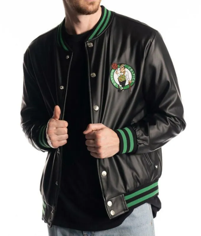 Boston Celtics Black Leather Bomber Varsity Jacket