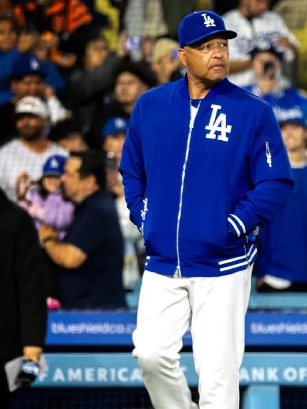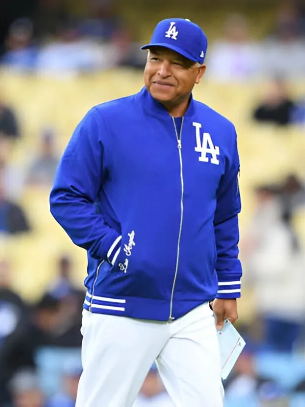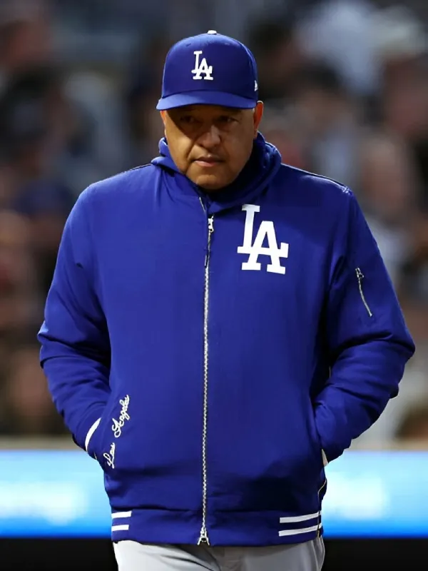The jacket is composed of fleece and has a soft viscose layer. It features long sleeves with ribbed cuffs, a rib-knit hemline, a front zipper closure, and a hooded collar. It is blue and features two slant pockets up front and two convenient pockets inside. Dave’s distinctive style is just one of the many reasons why the fans adore him. After Dave Roberts was recently captured on camera, baseball fans worldwide became very interested in his clothing. Fans are clamoring for a Dave Roberts LA Dodgers Blue Bomber Jacket.