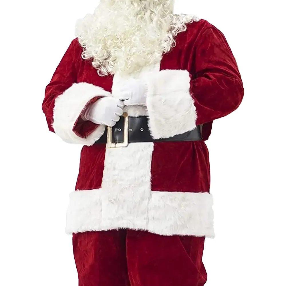 I love the white shearling details especially around the cuffs and hem they give it that classic Santa flair. The bright red color stands out beautifully in winter lighting.
