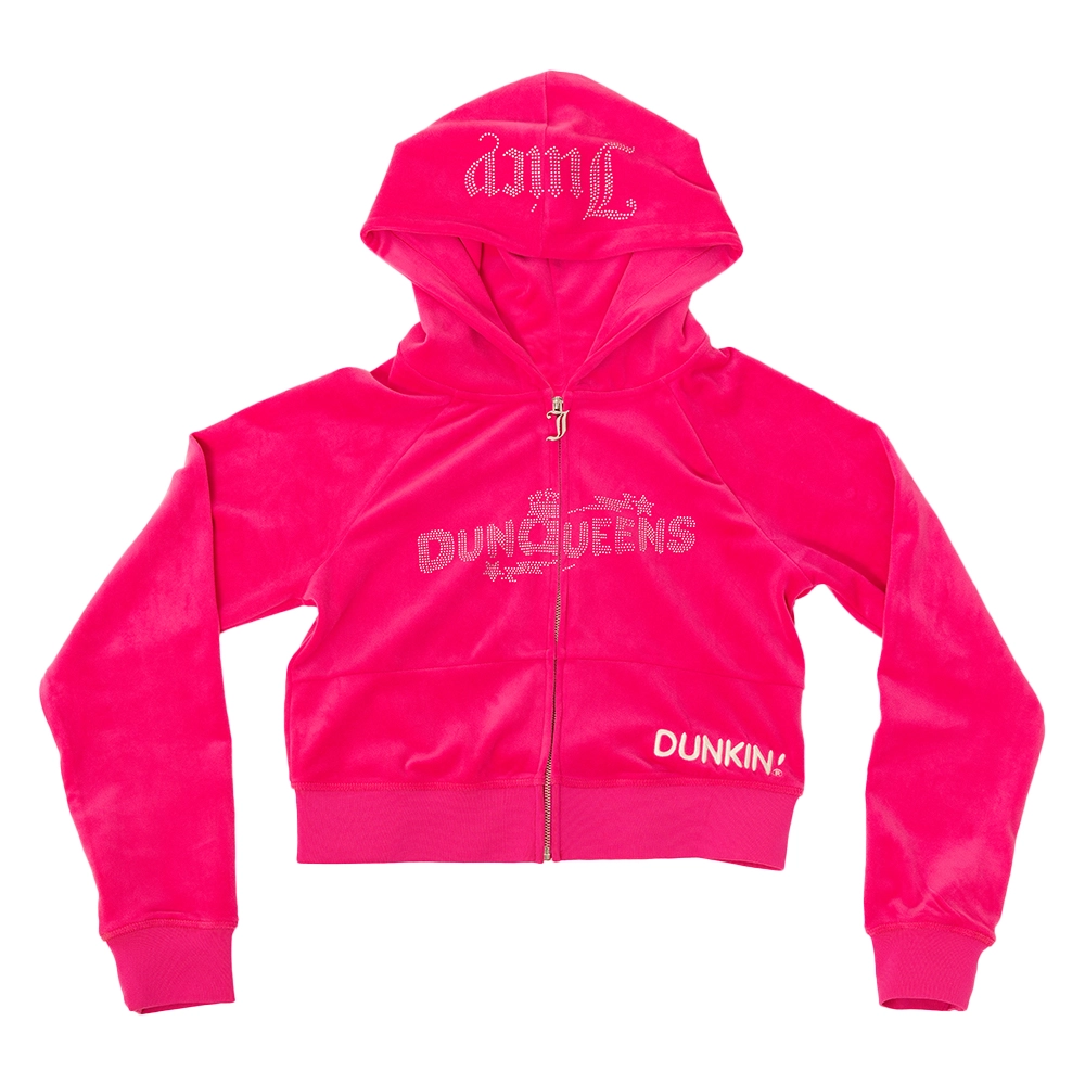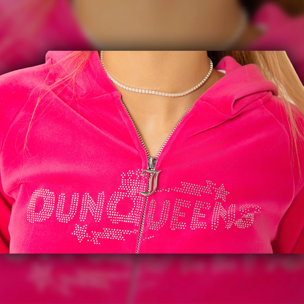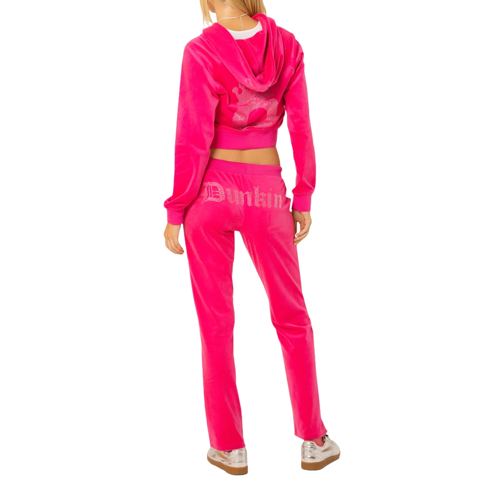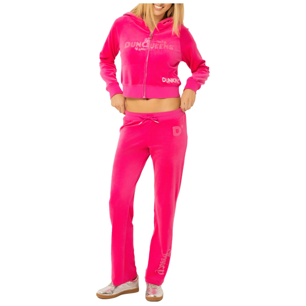 The Dunkin DunQueens Tracksuit is an outfit that gives comfort while standing out. This outfit is crafted from premium velvet fabric which is a very soothing and luxurious material to wear. In addition to that, the Dunkin suit brings a playful twist to the compilation, with its vibrant pink color. It can effortlessly make a bold statement while running errands, lounging at home, or wearing it with friends. For added comfort during colder seasons, the jacket’s hooded collar is accompanied by a smooth zipper for easy wearing and taking off. Ensuring a snug fit for the outfit are the rib-knitted cuffs directly placed around the opening of the arms.