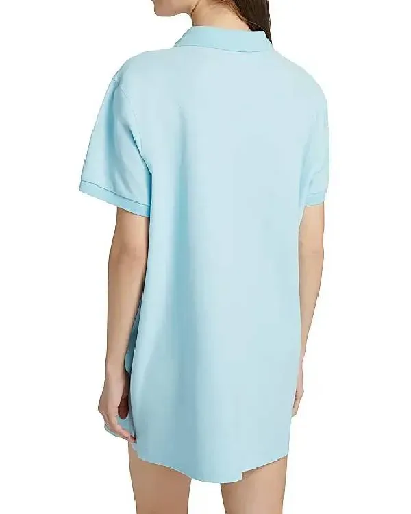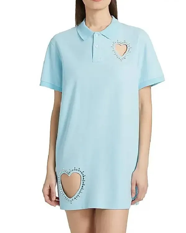 This dress is comfortable and stylish because it is made of soft, cozy fleece. It features a traditional shirt collar for a polished look and short sleeves for a loose fit. The light blue color conveys a sense of youth and freshness, making it perfect for spring and summer days. The most obvious element is the heart cutout, which adds a cute and fashionable twist to the polo dress design. Whether you are going out with friends, attending an event, or just want to switch things up, this dress is a chic addition to any wardrobe.