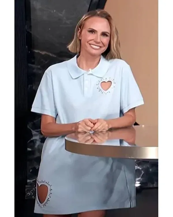 The stylish and entertaining E! News Keltie Knight Blue Heart Cutout Polo Dress was inspired by the stylish TV host Keltie Knight. Known for her vibrant personality and bold fashion choices, Keltie usually wears outfits that blend sophistication with a playful touch. This light blue dress with a heart-shaped cutout adds a flirtatious and unique touch, much like Keltie’s on-screen appearance. Whether you like her appearances on E! News or you just like dresses that make a statement, this dress is perfect for showing off your charm and confidence in any semi-formal or casual setting.