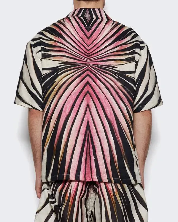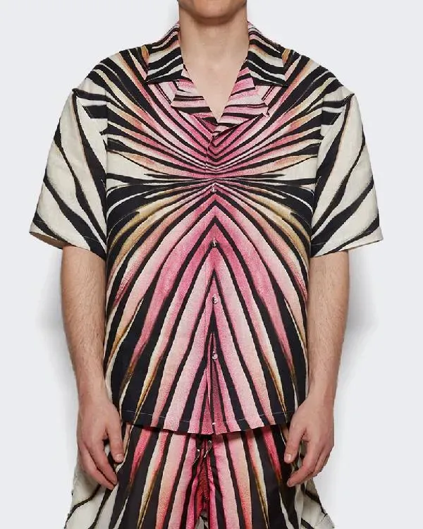 The cotton used to make this shirt makes it soft and comfortable to wear. It has a cool, relaxed vibe thanks to its Cuban-style collar. The shirt’s buttoned closure allows you to wear it open or closed. The short sleeves are perfect for warm weather. The open hems of the cuffs offer a simple, tidy finish. The shirt is mostly pink with black and white stripes on the sides and a pink center. This design gives the shirt a unique and stylish look. It is a great choice for people who like bright, bold fashion.