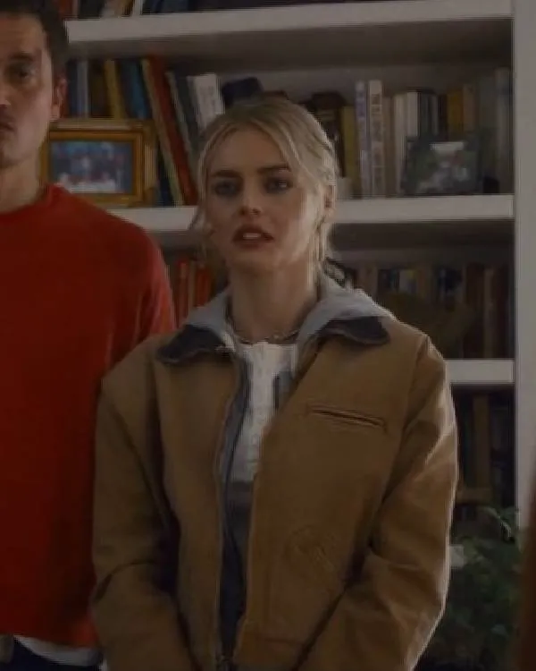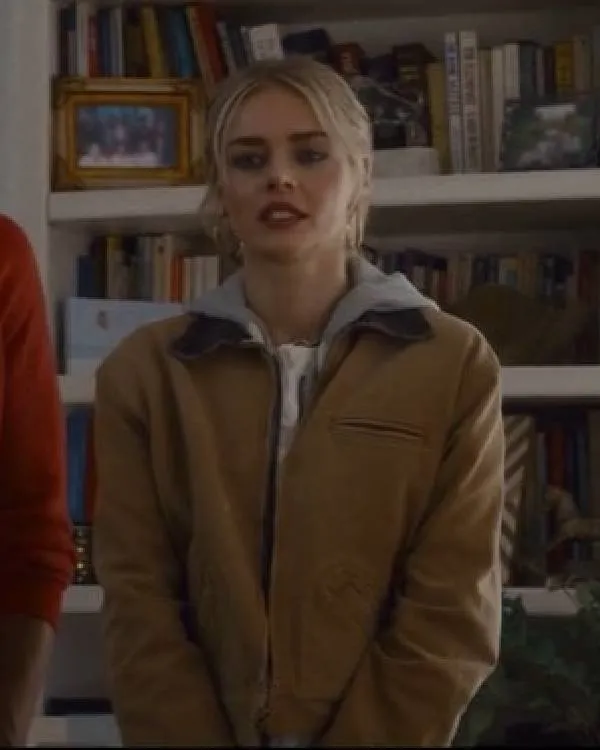 Samara Weaving’s character in Eenie Meanie is strong and stylish, and her attire gives her character even more nuance. Her brown suede leather jacket is one particularly striking piece of clothing that gives her a self-assured, contemporary appearance. It perfectly complements her character’s bold yet elegant demeanor, giving her a stylish and commanding on-screen persona. Her character is made memorable and visually arresting in every scene by the earthy brown color of the jacket, which adds a touch of sophistication. The way that this ensemble combined style with the character’s commanding presence won over fans and left a lasting impression throughout the movie.
