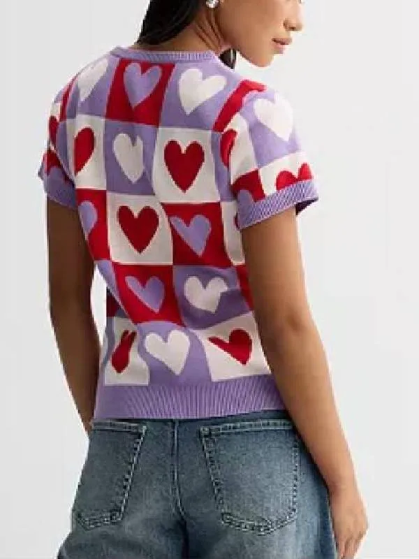 A great example of fashionable comfort designed for daily use is this crewneck sweater. It is made of soft knitted fabric that is kind to your skin and helps you stay relaxed all day. The crewneck collar adds a simple, timeless touch, and the pullover design makes it easy to wear. It is appropriate for mild weather because of its short sleeves, which make it feel light and breathable. The heart print design adds a whimsical and endearing vibe, while the color purple adds a new and fashionable appearance. Rib knit cuffs help keep the shape and offer a tidy finish. This sweater is a great option for informal events, get-togethers, or laid-back weekends because it looks good with jeans, skirts, or casual pants. It is a chic and cozy addition to any contemporary wardrobe.