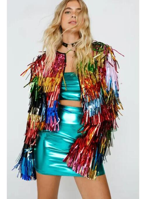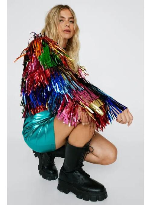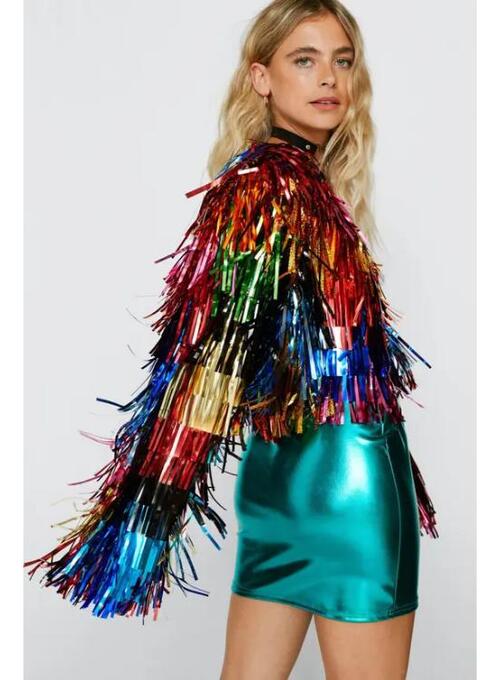 This multicolored cropped jacket is meant for those who appreciate fashionable and entertaining apparel. The glossy tinsel finish gives it a lively, dynamic appearance that makes it ideal for making a statement in any setting. The cropped look complements high-waisted apparel and adds a modern touch. Because it is lightweight and comfortable, it is suitable for casual outings or evening events. The standard fit ensures a polished yet relaxed appearance. This jacket will appeal to anyone who enjoys vibrant colors with a stylish touch.