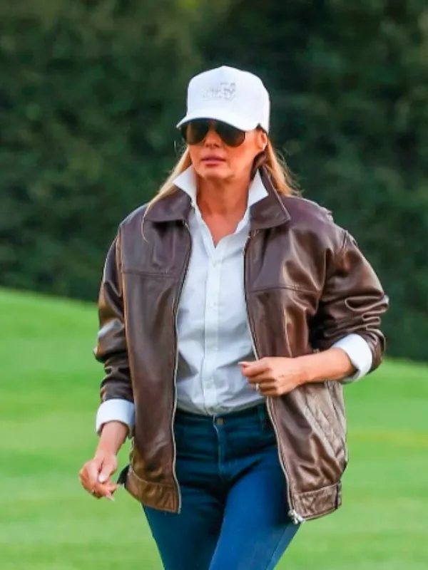 The former first lady is renowned for her style choices, which usually blend strong, structured silhouettes with high couture. She has a confident, polished appearance that frequently draws attention. She is renowned for her elegant gowns and sophisticated coats, but she has also embraced more casual yet impactful looks. This aviator-inspired outfit, which featured dark denim and aviator shades, showed off her ability to effortlessly blend First Lady elegance with military-casual flair while on an official visit. Because it embodies a timeless classic that radiates strength and style, her choice of a First Lady Melania Brown Leather Jacket is highly sought-after by those who appreciate authoritative fashion.