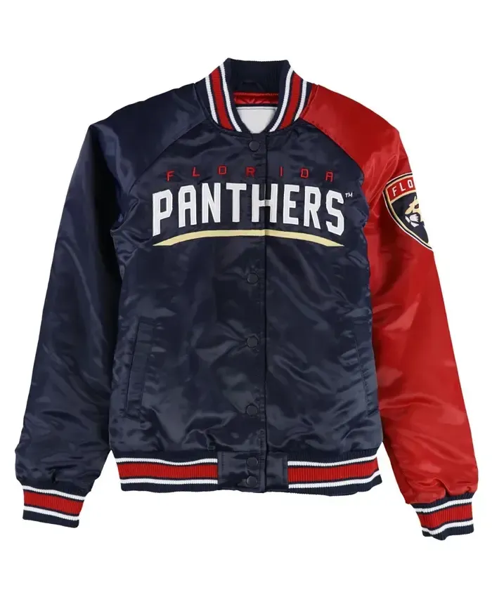 Show your support for the Florida Panthers with this attention grabbing Florida Panthers Hometown Varsity Satin Jacket combines modern aesthetics with team pride. This is straightforwardly stylish and comfortable, which is ideal for passionate supporters. It has black and blue satin colors on the outside making for a striking and energetic impression ensuring that you never go unnoticed. Complemented with a classic rib knit collar and cuffs that provide comfort while also giving a timeless athletic feel.