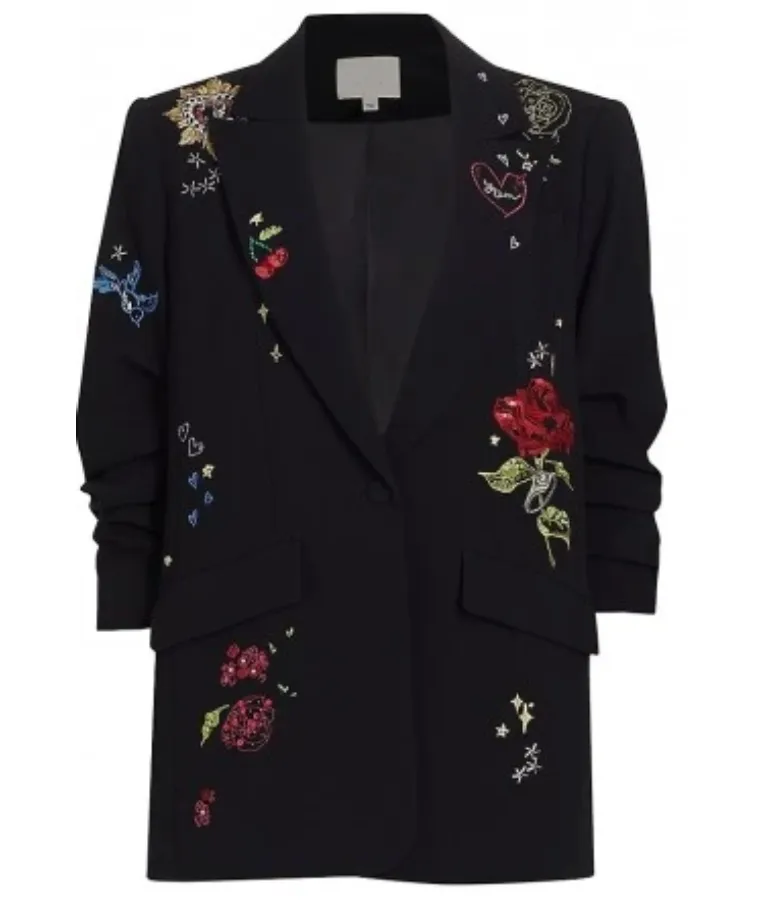 This Maxie Jones Black Embroidered Blazer is composed of high-quality suit fabric and is designed to fit you comfortably and structurally. The smooth viscose lining inside makes it comfortable to wear for long periods of time. The blazer’s full-length sleeves with buttoned cuffs, front button closure, and classic notch lapel collar give it a classic and refined look. You will have plenty space to keep little essentials thanks to the two waist pockets and the two internal pockets. The most striking aspect of this blazer is the exquisite embroidery, which adds a unique and stylish touch to the classic black color. Whether you are wearing it to a formal event, the office, or just to copy Maxie Jones’s timeless style, this blazer is the perfect addition to your wardrobe. You should continue to be elegant, bold, and carefree like Maxie.