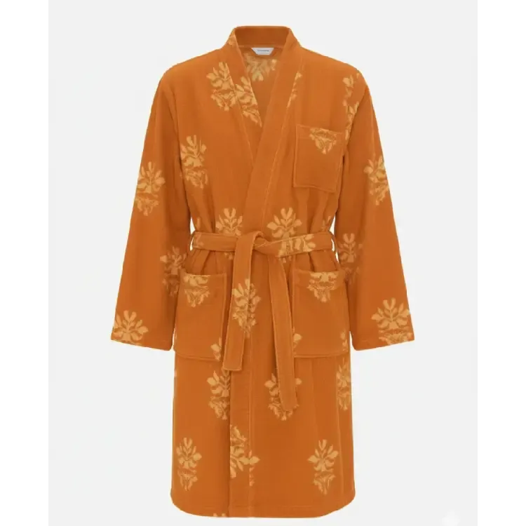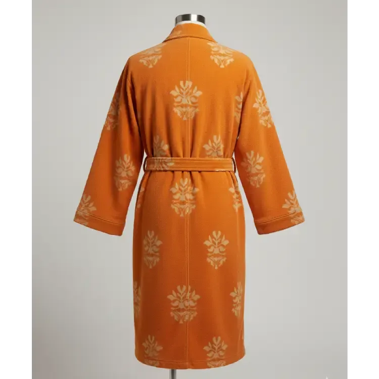 The wool fabric is breathable yet insulating, making it suitable for various climates. The bold orange color adds energy to any outfit. The robe feels well-made with fine stitching.
