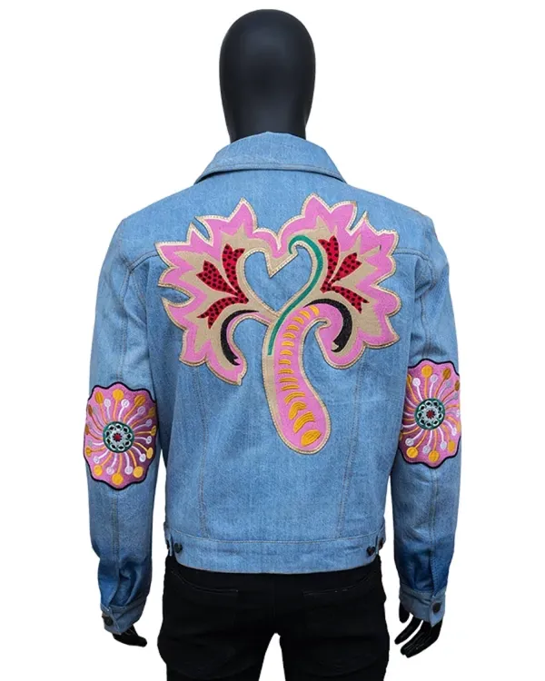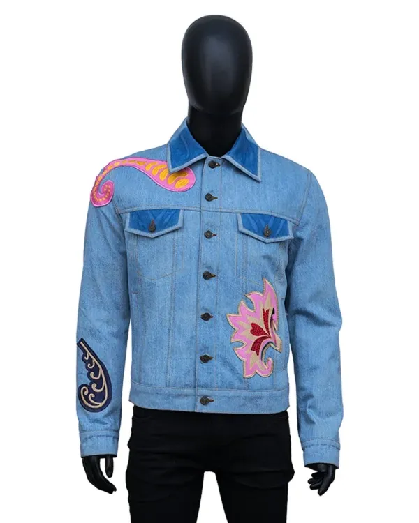 This floral denim jacket’s light wash blue denim provides both comfort and style. It has a point collar with contrasting fabric for a stylish look. It looks polished thanks to the long sleeves’ buttoned cuffs. The front has a button-down fastening and two button-flap chest pockets, making it both fashionable and practical. This jacket is perfect for both formal events and casual get together because of its straightforward design and straight hem.