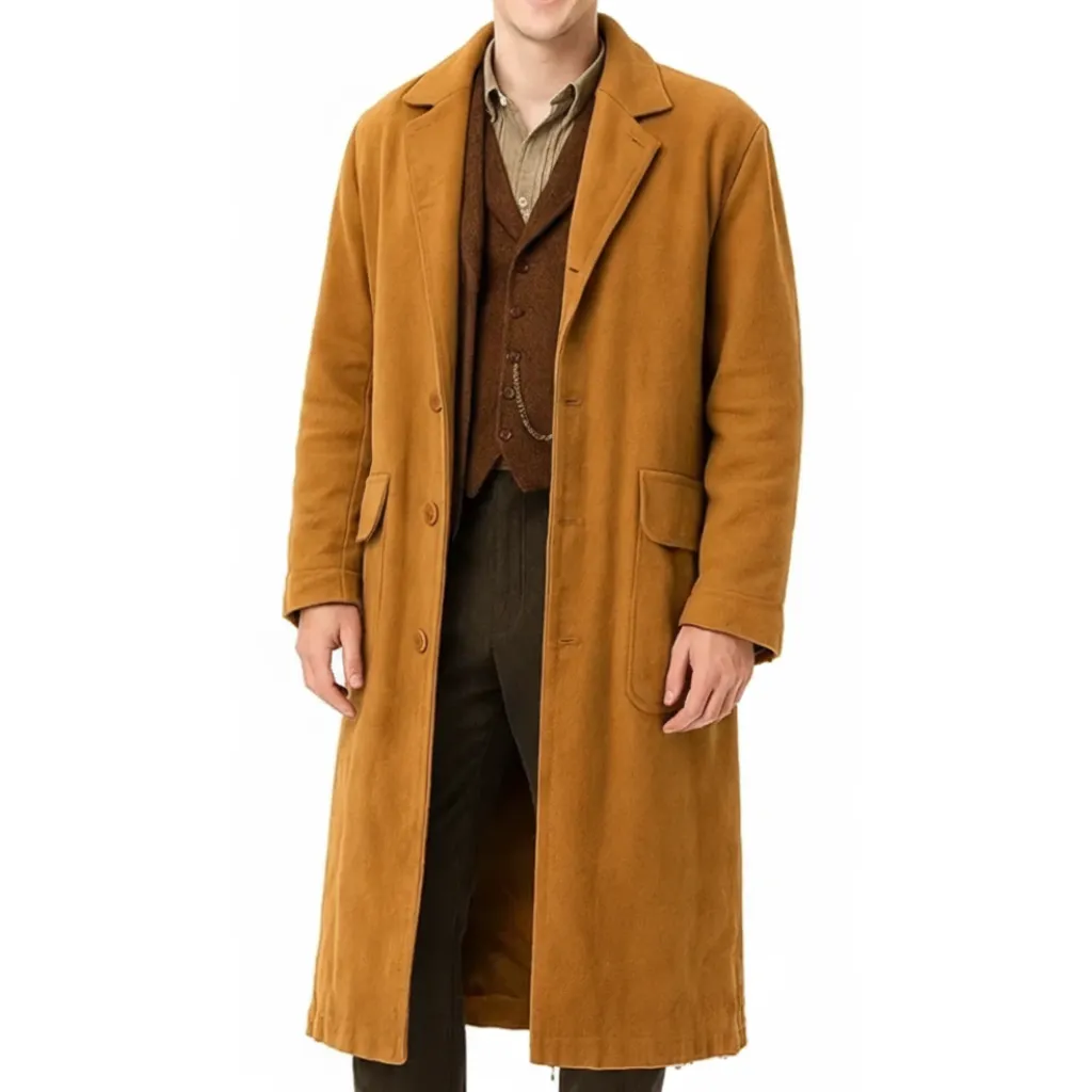 The Guinness Jack Long Coat represents a sophisticated blend of traditional style and contemporary tailoring, making it an exceptional choice for those in search of enduring elegance. Constructed from premium wool, it offers both warmth and longevity while preserving a structured, refined silhouette. The viscose lining contributes to comfort, providing a smooth interior that remains light and breathable for prolonged wear. Featuring a lapel style collar and a buttoned front closure, it reflects a classic design approach, resulting in a silhouette that is both timeless and polished. The full-length sleeves with open hem cuffs enhance the outfit’s graceful proportions, while the deep brown color adds richness and depth, giving it a versatile charm. Just as coat conveys a sense of subtle authority on screen, this design captures that same allure in an outerwear piece suitable for modern wardrobes.
