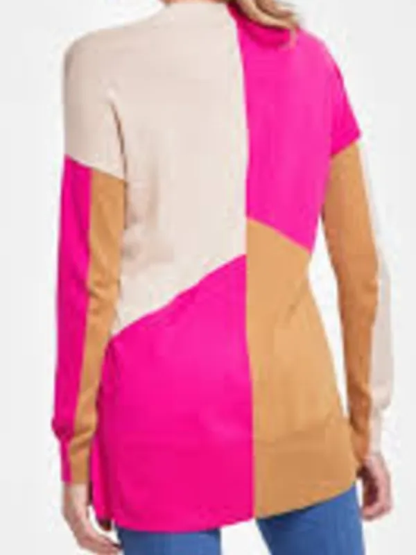 The full-length sleeves and V-neck collar create a flattering silhouette, while the rounded cuffs give a neat finish. The pull-over closure makes it simple to slip on, and the multicolor design adds visual interest to an otherwise simple piece.