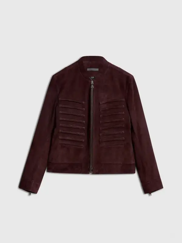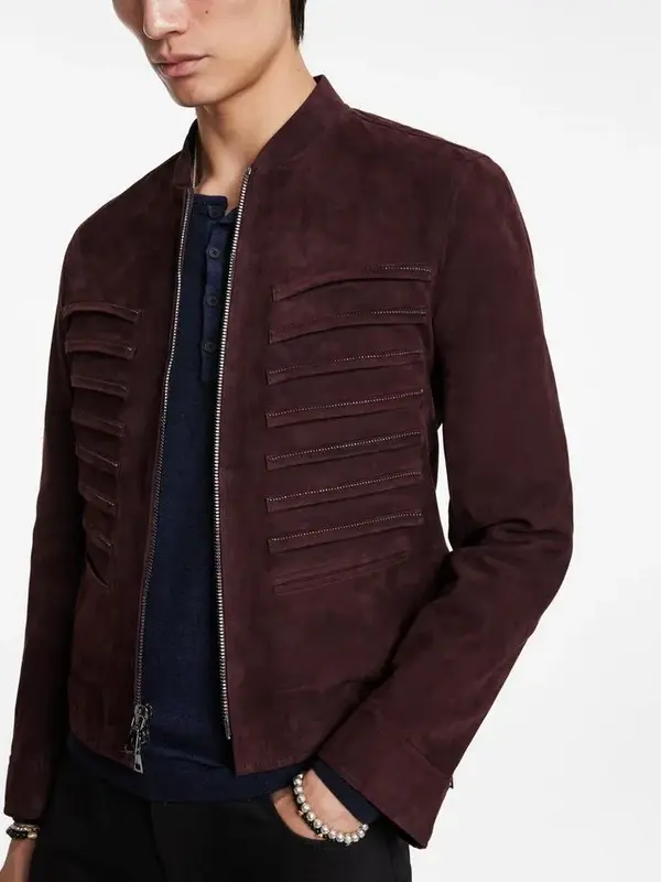 The suede leather gives the jacket a premium feel, and the rounded collar adds a unique touch. The craftsmanship is solid, with attention to detail on the stitching and zippers.
