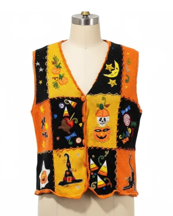 The Haul Out the Halloween Lacey Chabert Knit Vest is both comfortable and fashionable, crafted from soft knit fabric. Its stylish V neck collar and sleeveless design make it ideal for layering over shirts or blouses during cooler weather. The buttoned closure allows for versatile styling, enabling you to wear it open or closed, adding a touch of refinement. The sleek black hue of the vest is enhanced by a unique graphic design that infuses a playful Halloween atmosphere. For those who appreciate fashion with a seasonal flair, this piece inspired by Lacey Chabert is essential for casual gatherings, themed parties, or cozy evenings at home.