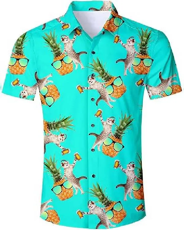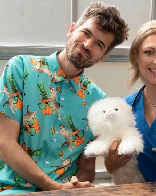 The lightweight polyester fabric used to make the House of Cats Ivo Graham Cat Pineapple Hawaiian Shirt makes it easy to wear and pleasant, especially in warm weather. For a laid-back yet polished appearance, it has a traditional shirt collar with a straightforward buttoned front. This shirt’s short sleeves keep it airy and informal, making it ideal for summertime excursions or vacation attire. It has a distinctive and amusing touch thanks to the adorable cat and pineapple print, which goes great with shorts, jeans, or casual pants. Its vivid green hue adds a crisp, tropical vibe, making it an excellent option for picnics, beach parties, and other informal gatherings. This Hawaiian shirt blends comfort, style, and personality, making it perfect for anyone looking to copy Ivo Graham’s playful appearance from House of Cats or just adding a fun and cozy piece to their closet.