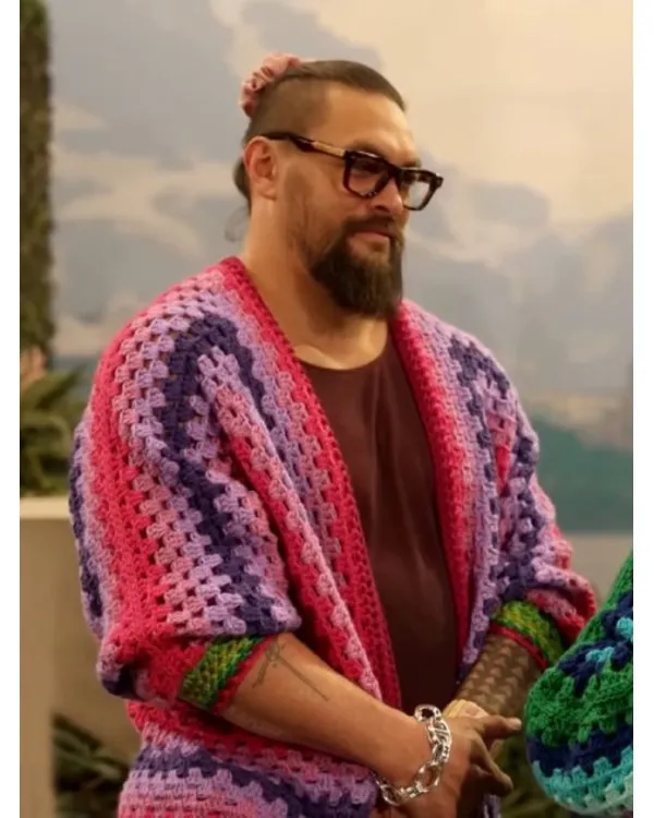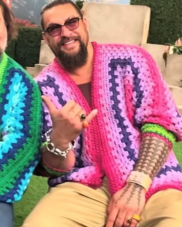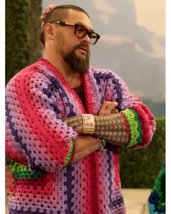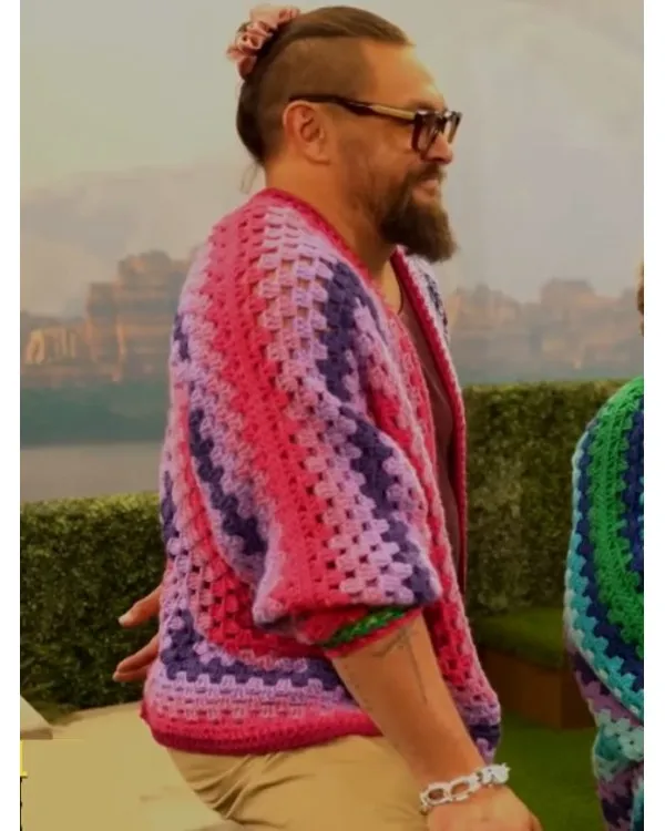 Jason Momoa Cardigan in Crochet The open-style cardigan, which was thoughtfully designed, has a V-neck collar that goes well with its relaxed appeal. Its long sleeves provide additional warmth, and the ribbed cuffs make it comfortable to wear. You can control the fit as you like thanks to the buttoned closure, which adds a simple yet useful contact. In any series, the multicolored sample makes a statement by giving the design vitality and strength. This item is a useful addition to any wardrobe because it blends functionality and a contemporary style. It’s ideal for an elegant beach day. It is all the more special because Jason Momoa wore it.