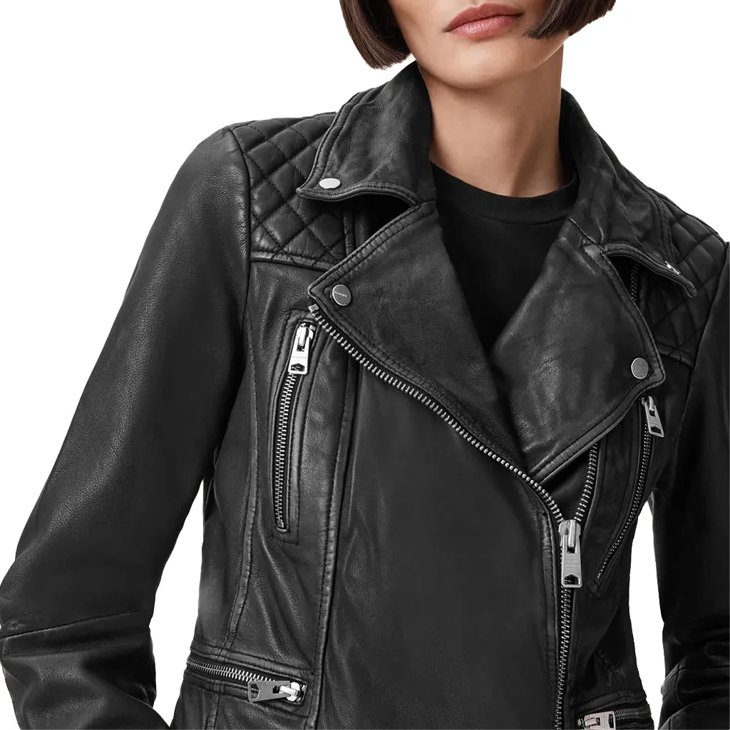 Because it is made of genuine leather, Kali Reis Mercy Jacket is long-lasting and has a high-end feel. It is appropriate for everyday wear because of the soft comfort provided by the inner viscose lining. It has a chic lapel collar that gives it a contemporary and elegant look. A secure fit and ease of wear are guaranteed by the front zipper closure. Its four exterior pockets and one interior pocket provide ample room to store your small necessities. The full-length sleeves offer total coverage and accentuate the stylish design. Kali Reis Mercy 2026 Leather Jacket has a distinctive appearance thanks to the texture and detail added by the quilted pattern. Its timeless black hue makes it simple to accessorize with jeans, boots, or laid-back ensembles for a chic street style look.