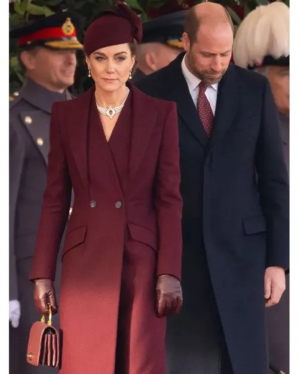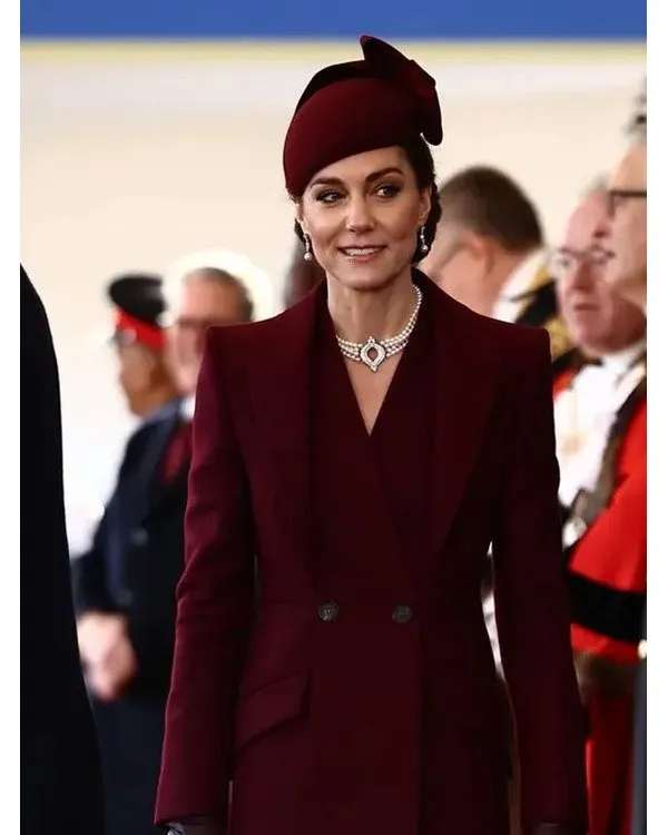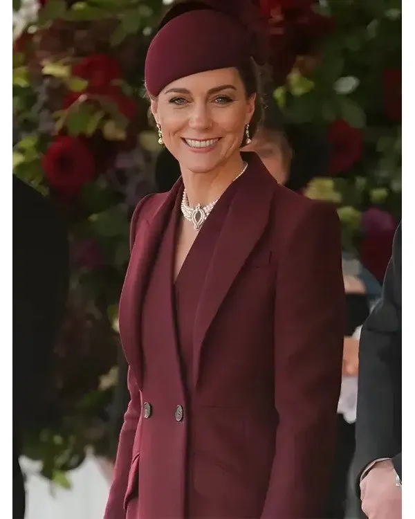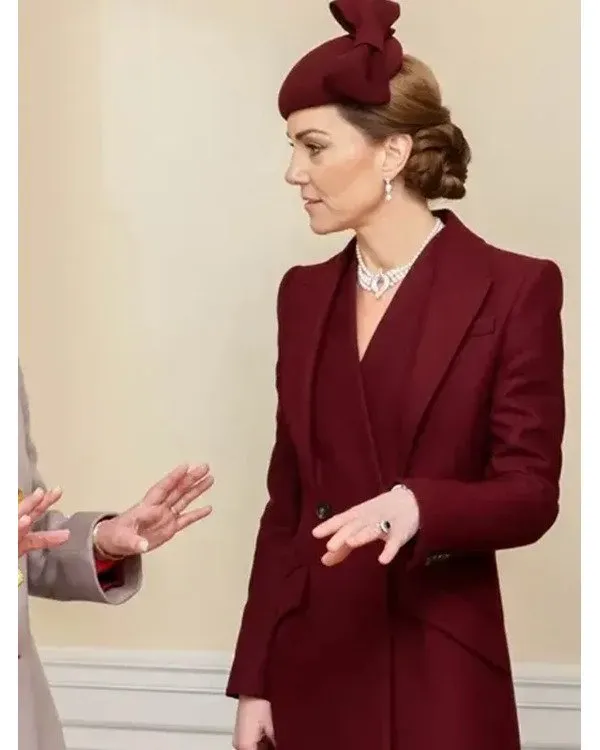 Kate Middleton, the Catherine Princess of Wales, is a member of the British royal circle of relatives. She grew up in Bucklebury, Berkshire, and got married to Prince William, heir to the British throne, at Westminster Abbey. Kate were given worldwide popularity as the Princess of Wales. Being a senior royal, she actively supports numerous reasons, such as intellectual fitness attention, early formative years development, and environmental conservation. She is thought for her elegance and determination to her position, Kate is also a style icon and a committed mom to her 3 children: Prince George, Princess Charlotte, and Prince Louis. she opted for this Kate Middleton Alexander McQueen Long Burgundy Coat. It is an attractive piece of attire in which she slays. And that is what made us carry it right here in our substantial attire collection for our fashionistas.