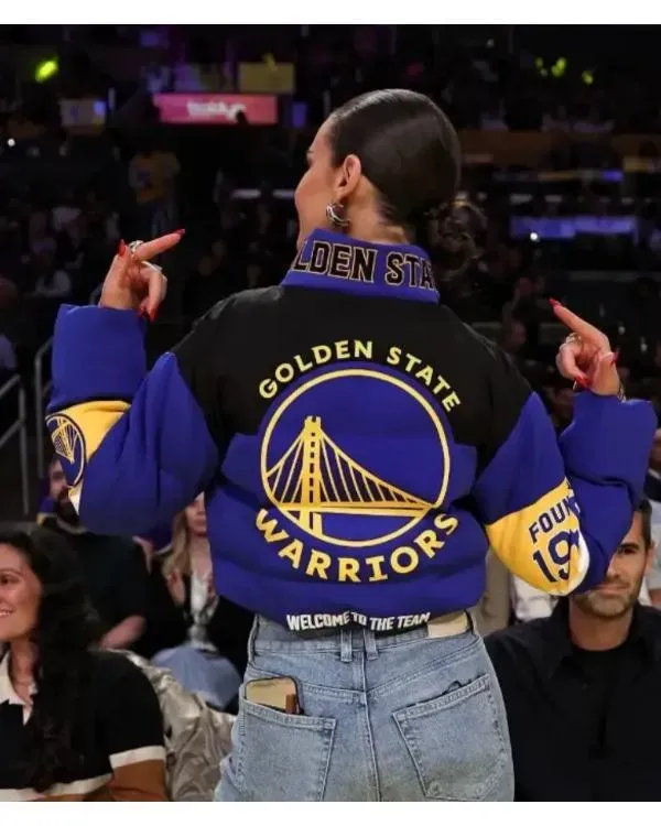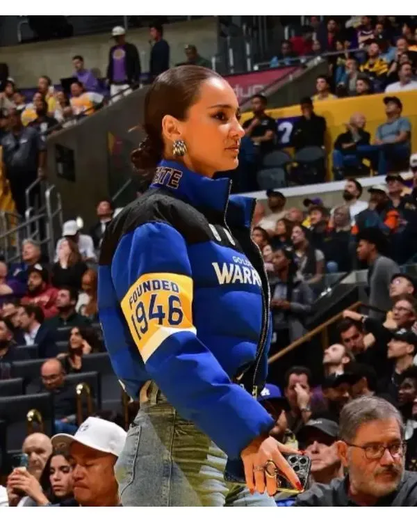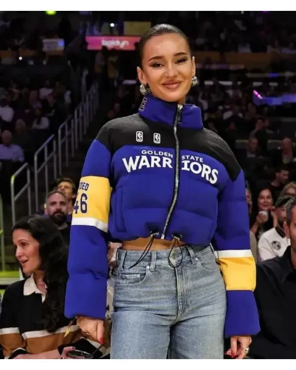 This cropped puffer jacket, which was made with Kristin’s signature fashion-forward flair, hits at the waist to create a sleek, modern cut that is in style right now. The Warriors’ iconic logo is prominently displayed, enormous, distinctive, and visible from every arena. Whether you are in the city or courtside, the striking royal blue, golden yellow, and white color blocking makes an immediate visual impression and guarantees that you draw attention.