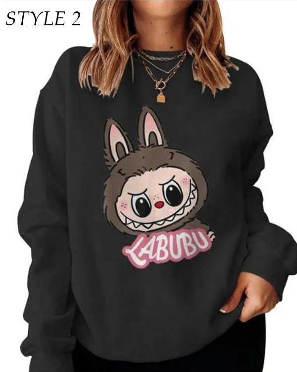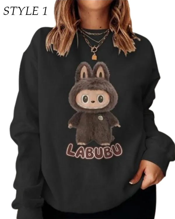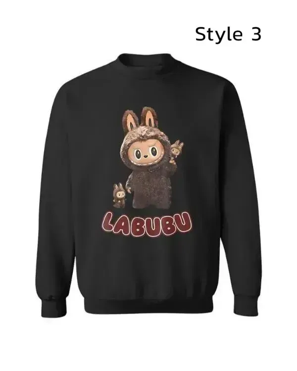 The warm, soft fleece fabric of this black sweatshirt makes it perfect for cooler weather. It features full-length sleeves with rib-knit cuffs for a snug and cozy fit. Its round collar gives it a classic, carefree look that complements joggers or jeans. What really makes this sweatshirt stand out is the unique Labubu print, which is available in three different styles so you can choose the one that suits you the best. This sweatshirt’s comfortable material, fun character print, and stylish black color make it ideal for laid-back get-togethers or warm days spent indoors.