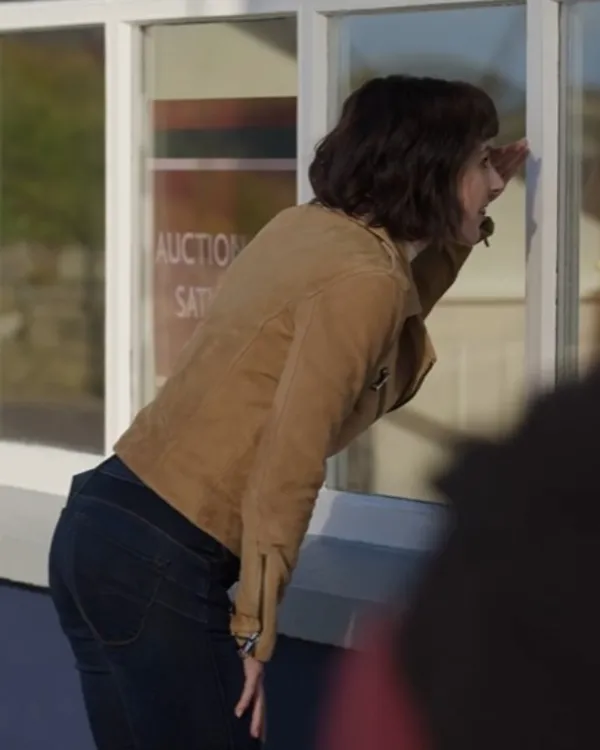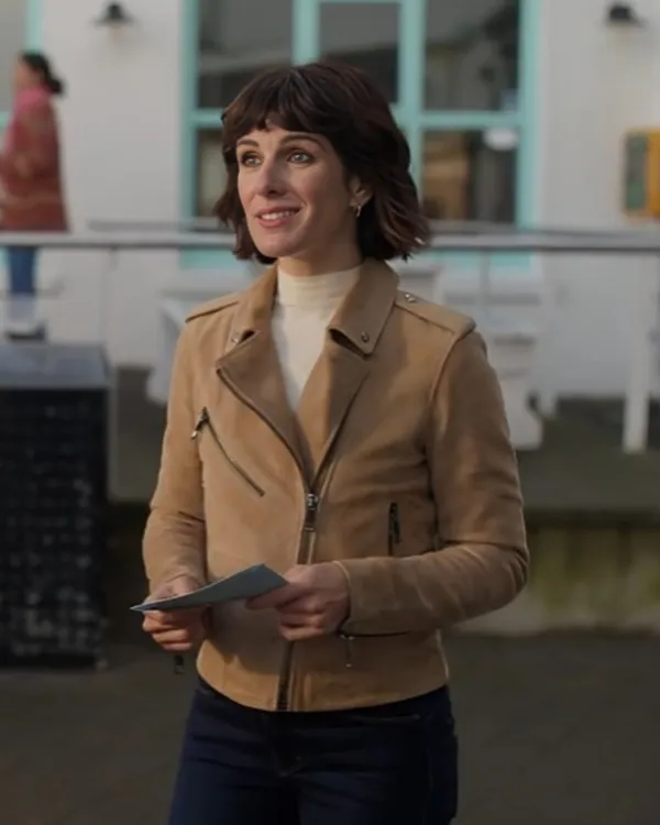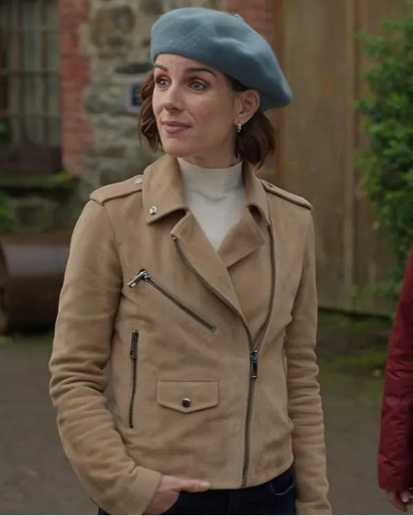This brown suede jacket, inspired by Shenae Grimes-Beech’s character in “Love of the Irish,” offers a stylish and contemporary look. The asymmetrical zipper closure and lapel-style collar add a modern touch, making it a versatile addition to various outfits.