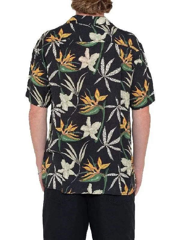 Color is deep black and really makes the floral pattern shine. Fit is relaxed but not baggy, just how I like it. Came a day early which was a great surprise.