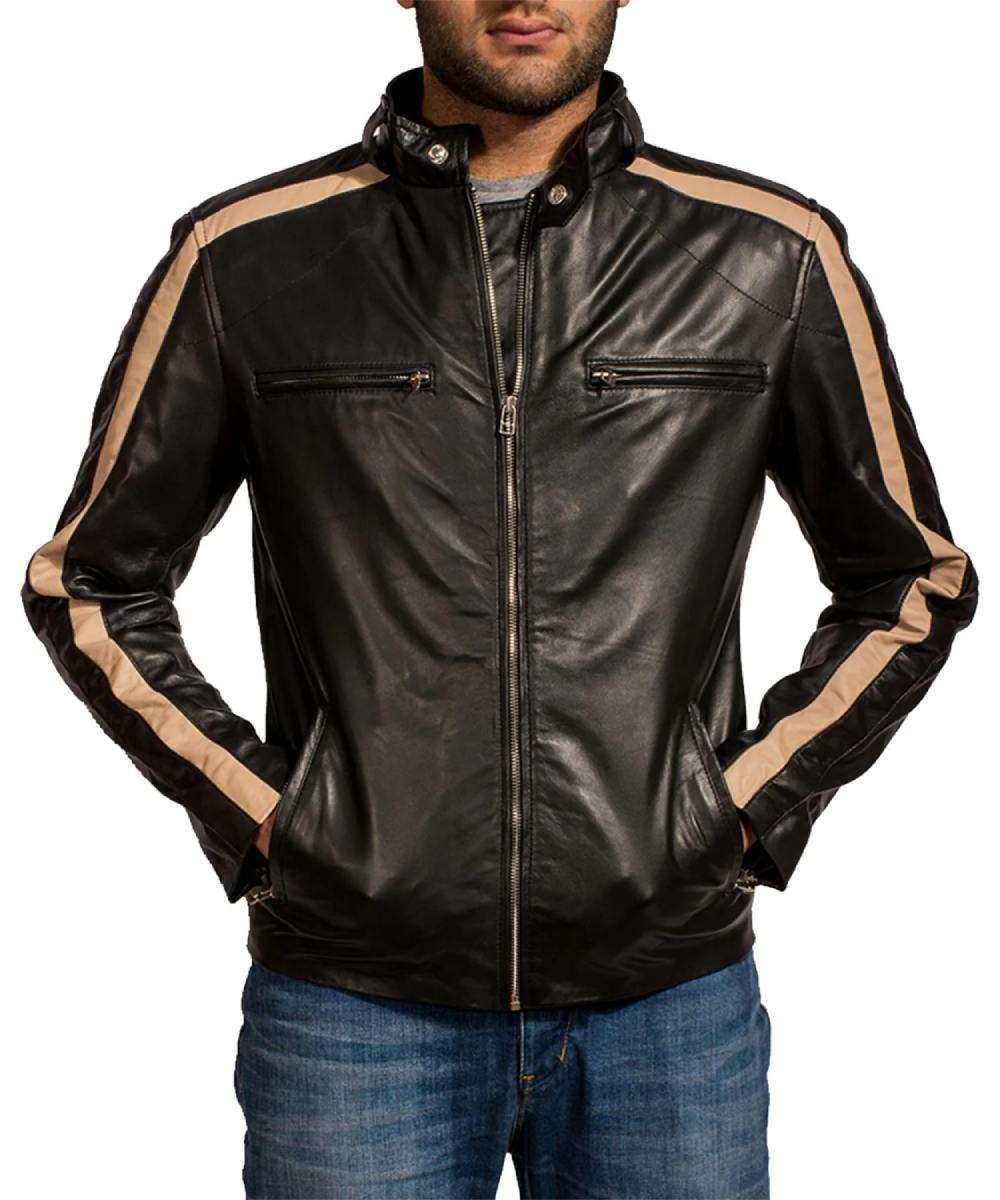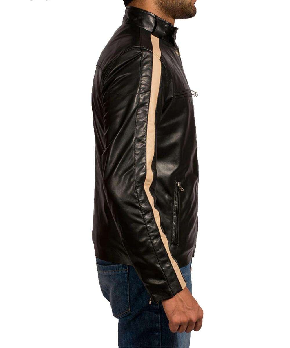 Don this Men’s Black Biker Cream Stripes Leather Jacket, and let your fashion sense roar. It’s not just a jacket; it’s a declaration of your style. Make it yours today.