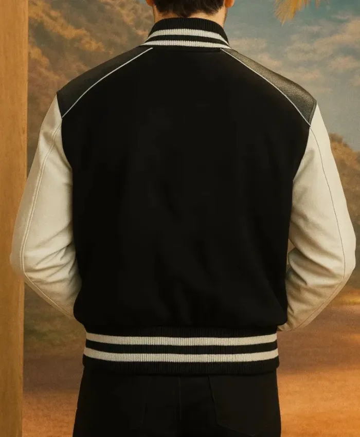 The Voice S28 Black and White by Michael Buble The wool material used to make the Varsity Jacket. It features a soft viscose lining inside that will provide you with a great deal of warmth and comfort. The garment features rib-knitted cuffs at the exact end of leather-fabricated sleeves. Additionally, it features a rib-knit hem, snap tab button front closure, and rib-knit collar. Its two inner pockets and two outer side pockets will provide you with space for your necessities. The classic is available in black and white.