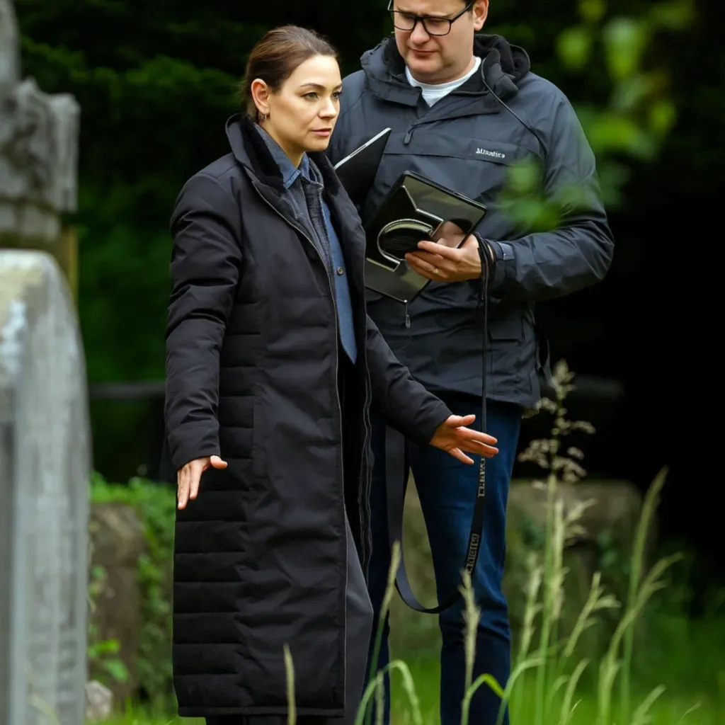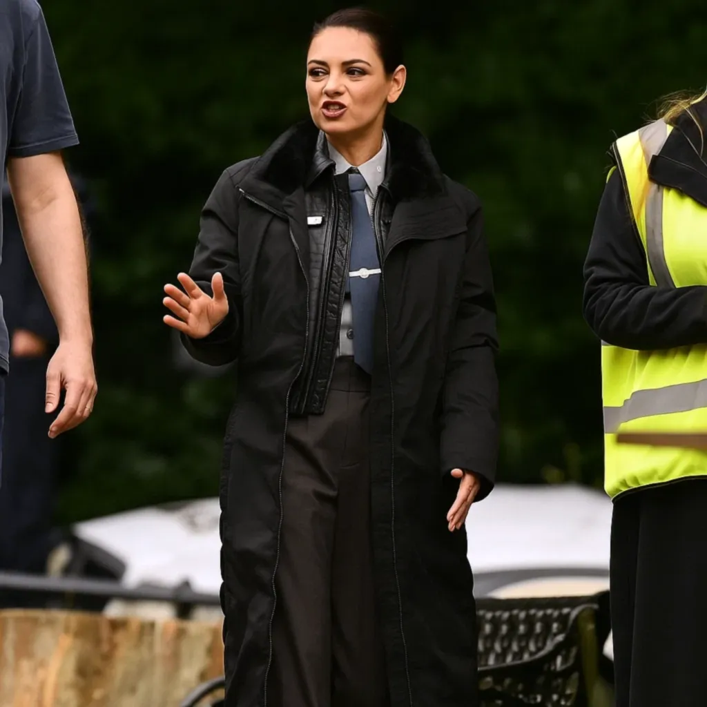 Mila Kunis Wake Up Dead Man 2025 Geraldine Scott Black Coat