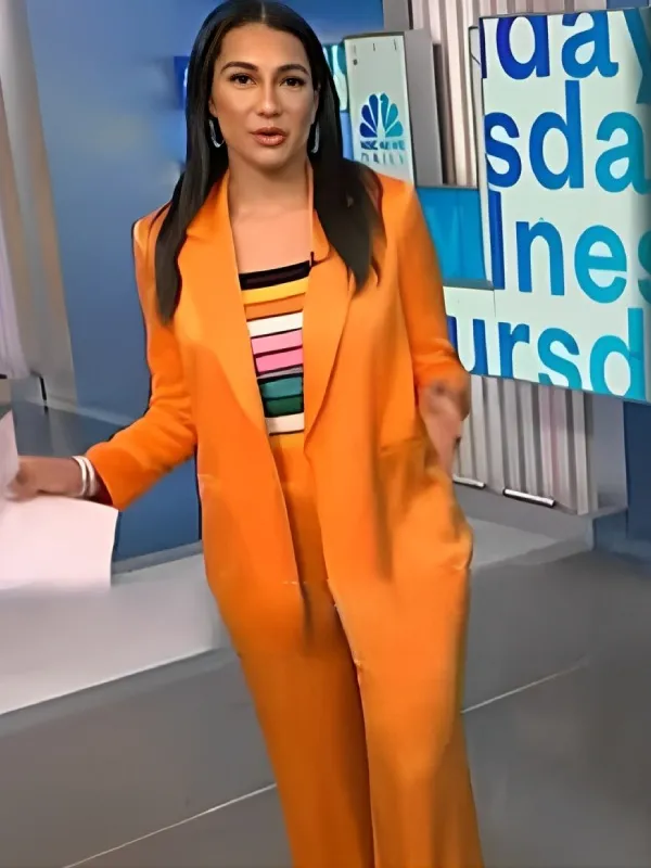 NBC News Daily 2025 Morgan Radford Blazer crafted with care, the blazer is lined with soft viscose cloth, enhancing comfort and breathability. It includes waist pockets at the outside and one interior pocket, presenting sufficient storage for small essentials. The cuffs are designed in a round fashion, including a smooth and dependent finish to the overall look. Paired with matching orange pants, made from the identical tremendous cloth, this outfit is both elegant and cohesive. The pants characteristic aspect wallet, complementing the blazer even as making sure practicality. This mixture affords a nicely-rounded, state-of-the-art appearance that balances both style and luxury, making it suitable for diverse occasions and occasions.