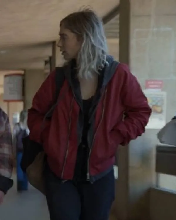 In Night Always Comes, Vanessa Kirby gives a strong performance, and her attire gives her character even more nuance. Her bold and determined personality is perfectly complemented by the Burgundy Bomber Jacket, one of her most notable outfits. Her character appears confident and prepared to take on any challenge thanks to the jacket’s strong and fashionable appearance. Its deep color and contemporary style showcase her bold side while also revealing a more delicate, stylish edge. Her character was visually striking and memorable throughout the movie thanks to this outfit, which fans adored.