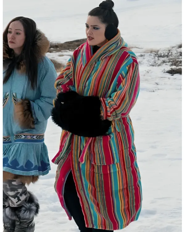 North of North Anna Lambe Multicolor Striped Robe is made from a wool-blend material that keeps warmth in and gives a soft outside feel. Inside, it holds a smooth layer that rests gently on the skin. The front is open, which lets the fabric hang freely without stiff lines. A hood adds cover and shapes the head area in a smooth round form. The long sleeves keep the arms safe from wind, and the ends fall straight without tight grips. Two pockets on the sides and one inside let you keep small items close without effort. The striped outer design, filled with different colors, gives it a quiet charm while still looking neat. Each part of the piece is made to feel light and easy while keeping a clear and tidy shape. The balance of ease and care in its design helps it suit calm hours spent inside or out.