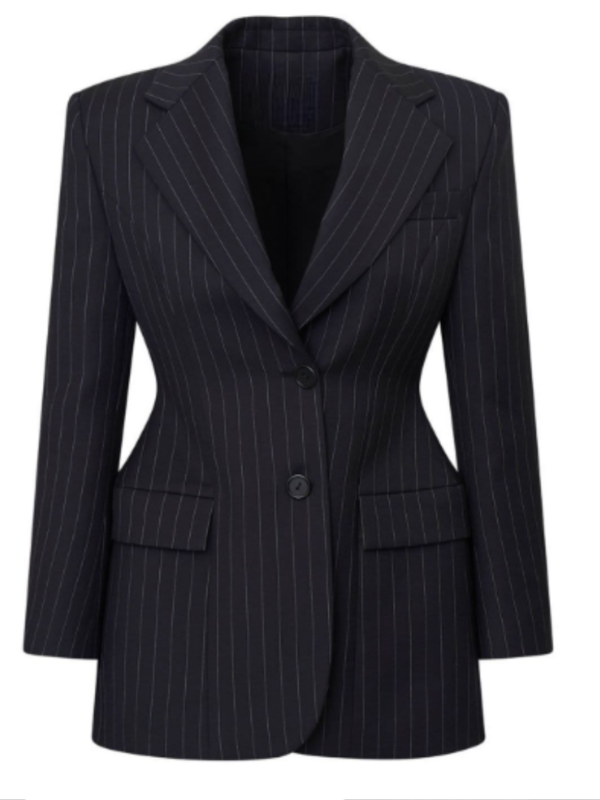 Suit fabric is used to make this Selena Gomez pinstriped blazer. For comfort, the inside is lined with a soft viscose fabric. For a neat and stylish appearance, the front features a button closure. A classic touch is added by the notched lapel collar. It has a sleek appearance thanks to the long sleeves and buttoned cuffs. It is also functional, with two outside and one inside waist pockets. Its pinstripes and black color give it a sophisticated yet contemporary vibe. This blazer is a fantastic option for every season and fashion sense.
