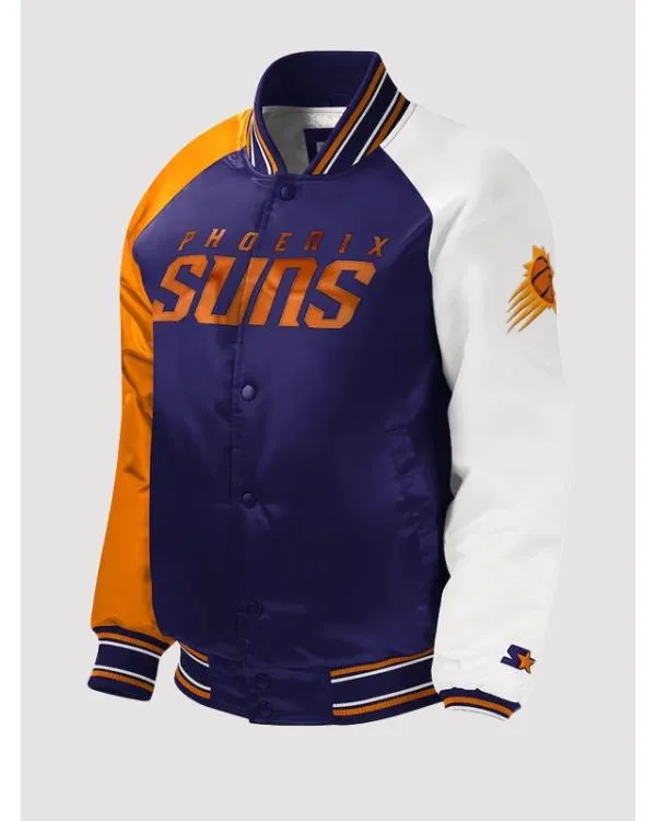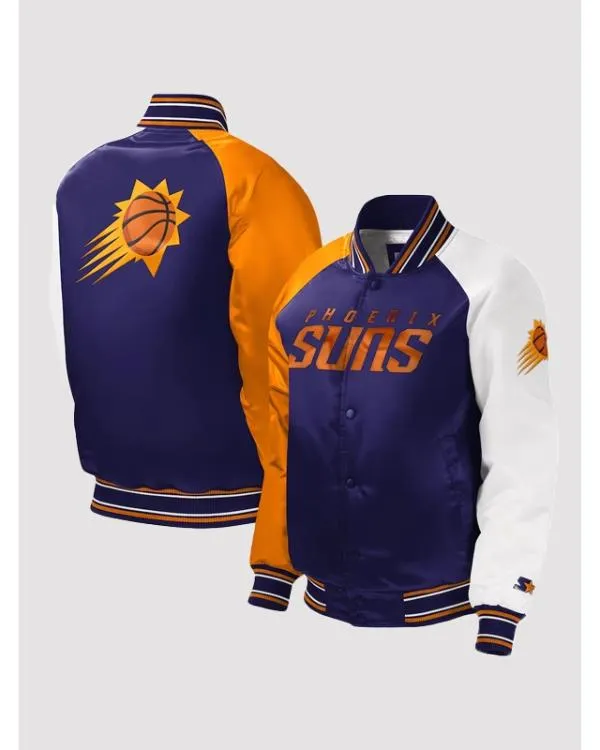 One of the NBA’s most well-liked teams, the Phoenix Suns are adored by supporters for their thrilling play and camaraderie. Young supporters particularly take pleasure in supporting their favorite athletes and doing so in fashionable and entertaining ways. They take pride in belonging to the Suns community and feel more connected to the game’s energy when they wear team-inspired apparel. For young fans who wish to show their team loyalty while looking stylish, the Phoenix Suns Starter Youth Raglan Full-Snap Purple Varsity Jacket is a fantastic option. It is ideal for game days, school, or daily wear because it embodies the Suns’ fun, energy, and vibrant colors.