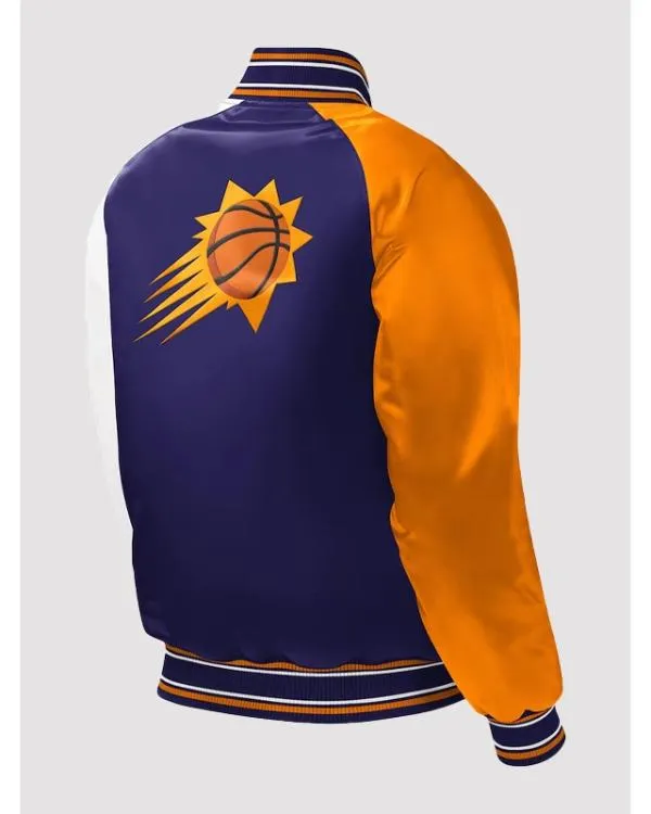 This varsity jacket has a soft viscose lining inside for comfort and is constructed from high-quality satin fabric. With a full button closure on the front, it has a timeless and comfortable appearance. Long sleeves, rib-knit cuffs, and a rib-knit collar give it a sporty look while keeping it warm and snug. It is useful for carrying small items because it has two inside and two outside pockets. With its striking multicolored design and purple foundation, it proudly captures the spirit and colors of the Phoenix Suns. This jacket is the ideal way for young fans to proudly and confidently represent their favorite NBA team because it is fashionable, cozy, and long-lasting.