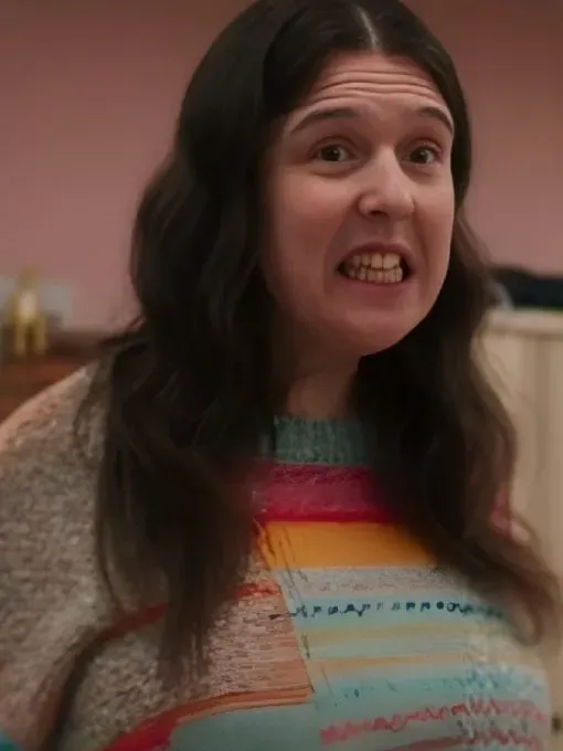 The Pushers’ first season The Rosie Jones Sweater was inspired by the vibrant and expressive character Emily. Every scene is made cozier and happier by Emily, who is known for her lively personality and positive vibes. Her creative spirit and love of life are reflected in her bold fashion choices. This sweater’s rainbow colors perfectly capture her unique sense of style and cheerful personality. Wearing it makes you feel confident, alive, and ready to take on the world, just like Emily did in the show.