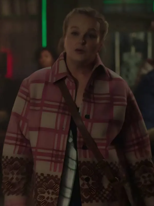 The Liv Baker Resident Alien season 4 is composed of a premium blend of wool. The Elizabeth Bowen Plaid Shacket is warm and durable. It is perfect for daily wear because the inner is lined with soft viscose for a comfortable fit. For a laid-back yet stylish appearance, the front has buttons and a conventional shirt collar. Its button cuffs and long sleeves offer structure without sacrificing comfort. This is the ideal layering piece for laid-back evenings or casual outings because of its vibrant pink color and floral patterns, which add a fun, eye-catching element.