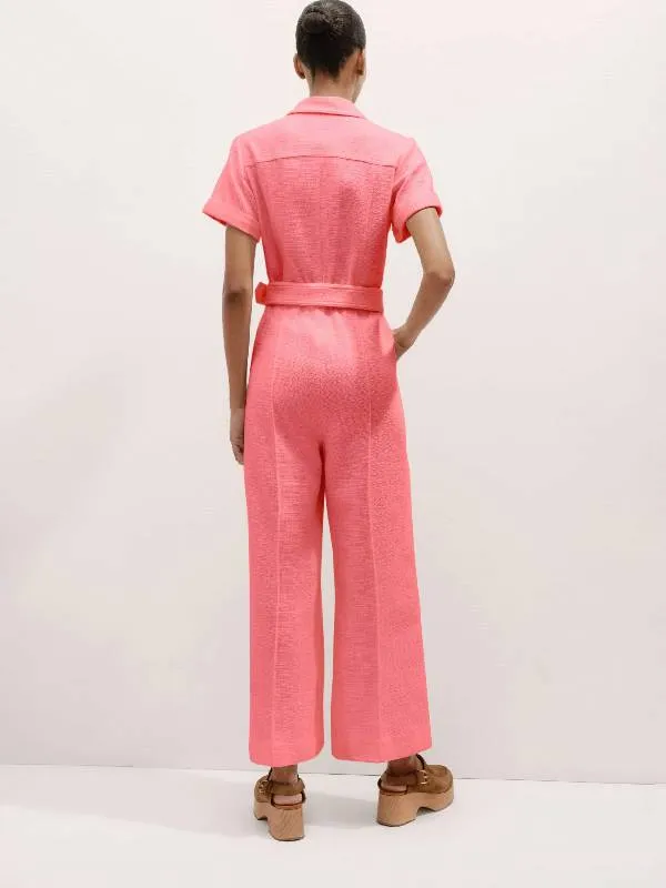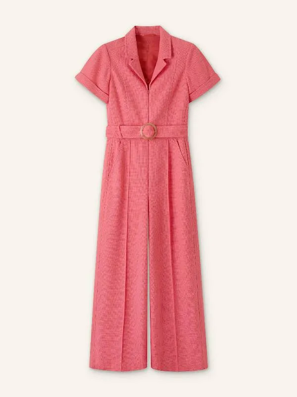 This jumpsuit, which is made of premium tweed fabric, has a fashionable structure and a cozy feel. The belted style and front zipper closure provide a snug fit and gorgeous waist definition. Its lapel-style collar gives the entire design a sophisticated and tidy appearance. The short sleeves keep the ensemble light and breathable, making it a great option for warmer days. It is ideal for daytime excursions or semi-casual gatherings because the soft pink hue adds a delicate and refined touch. You can easily combine this jumpsuit with flats or heels to create a variety of looks. It is a fantastic choice for women who want an easy-to-wear, fashionable outfit that is comfortable throughout the day.