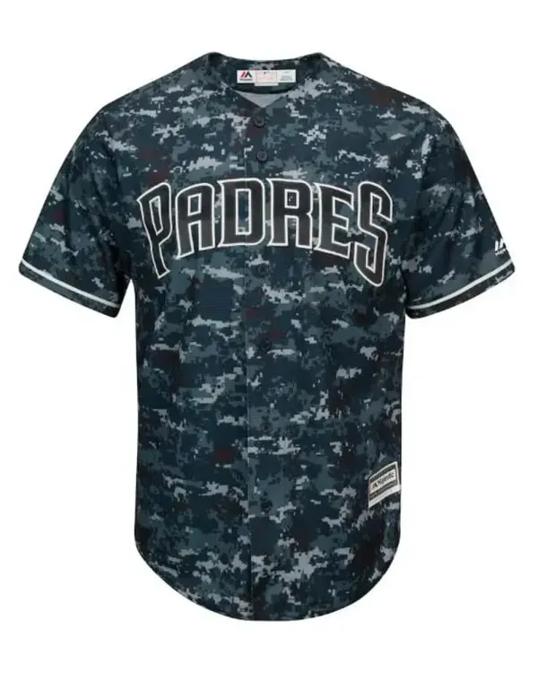 A popular team in Major League Baseball, the San Diego Padres are renowned for their devoted fan base and impressive performances. Watching the games is only one aspect of team support; another is dressing in a way that demonstrates pride and solidarity with other supporters. The *San Diego Padres Majestic Camo Cool Base Jersey*, which blends modern design with athletic flair, is the ideal way to achieve this. It stands out while still embodying the spirit of the Padres thanks to the camouflage print. This jersey gives supporters a fashionable and cozy way to feel connected to their favorite team, whether they are watching from home, at the ballpark, or out with friends.