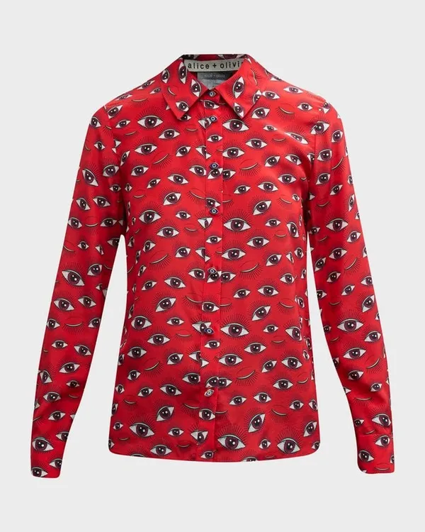 The soft cotton blend used to make this button-up top provides comfort and breathability all day long. The fabric feels soothing on the skin, making it perfect for long hours of usage. It boasts a pointed shirt collar that offers a clean and smart style. The buttoned cuffs enable a snug and tight fit, and the long sleeves offer complete coverage. A wide button-front fastening makes the top easy to wear and style in many ways. Jessica Williams Eye Print Top looks bold and fashionable because of the red hue and all-over eye print. It can be worn with skirts, jeans, or pants for a fashionable daily ensemble. For women who desire comfort, quality, and a contemporary style all in one, this top is a fantastic option.